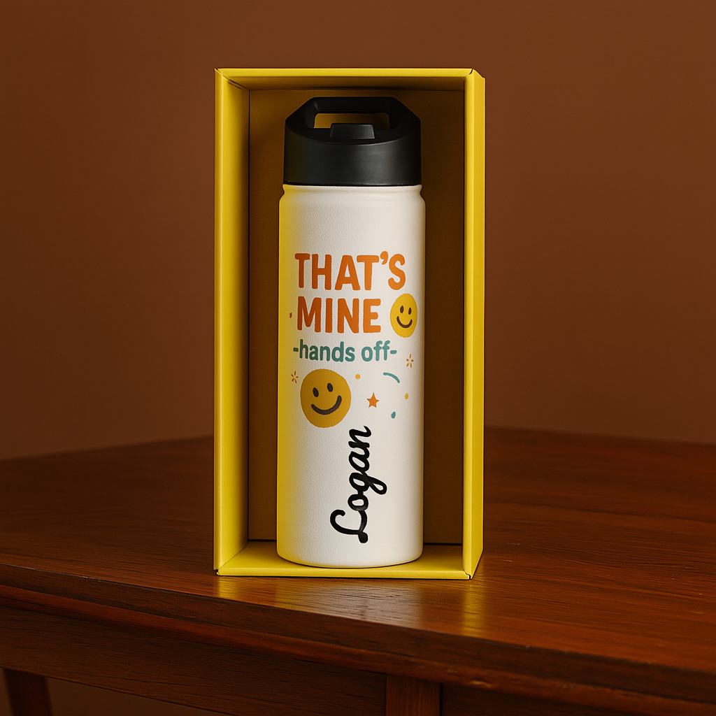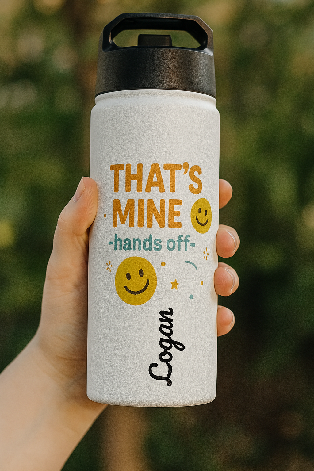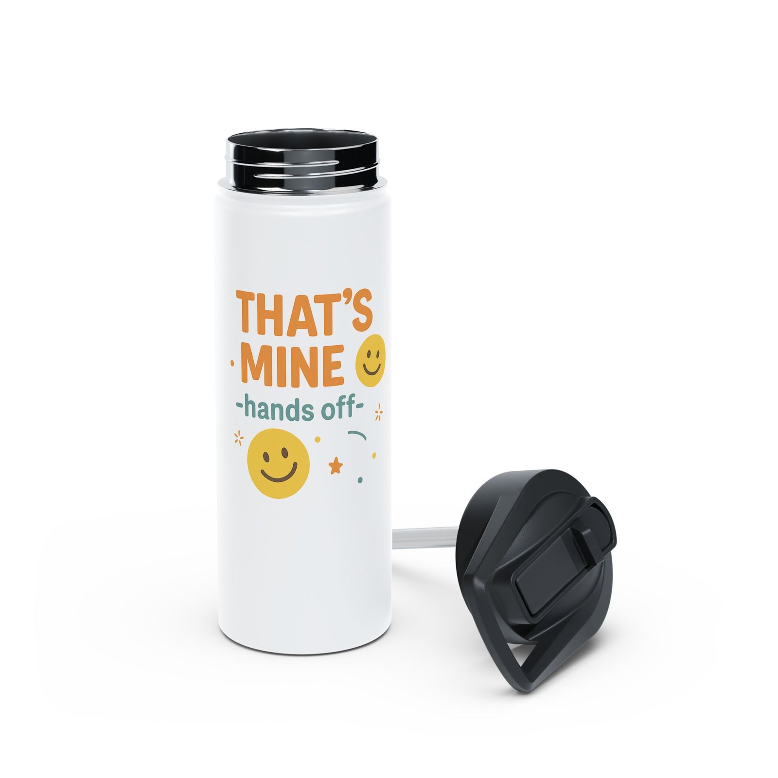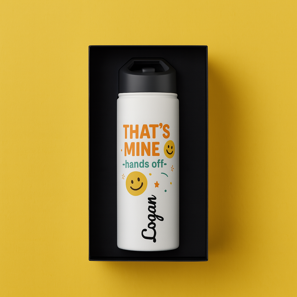 Our 18oz stainless steel bottle features a fun and bold “That’s Mine – Hands Off” message, surrounded by bright smiley faces and playful doodles. Whether you’re buying it for yourself or as a cheeky gift, it’s the perfect way to show some self-love and keep your drink safe from sneaky sippers.
