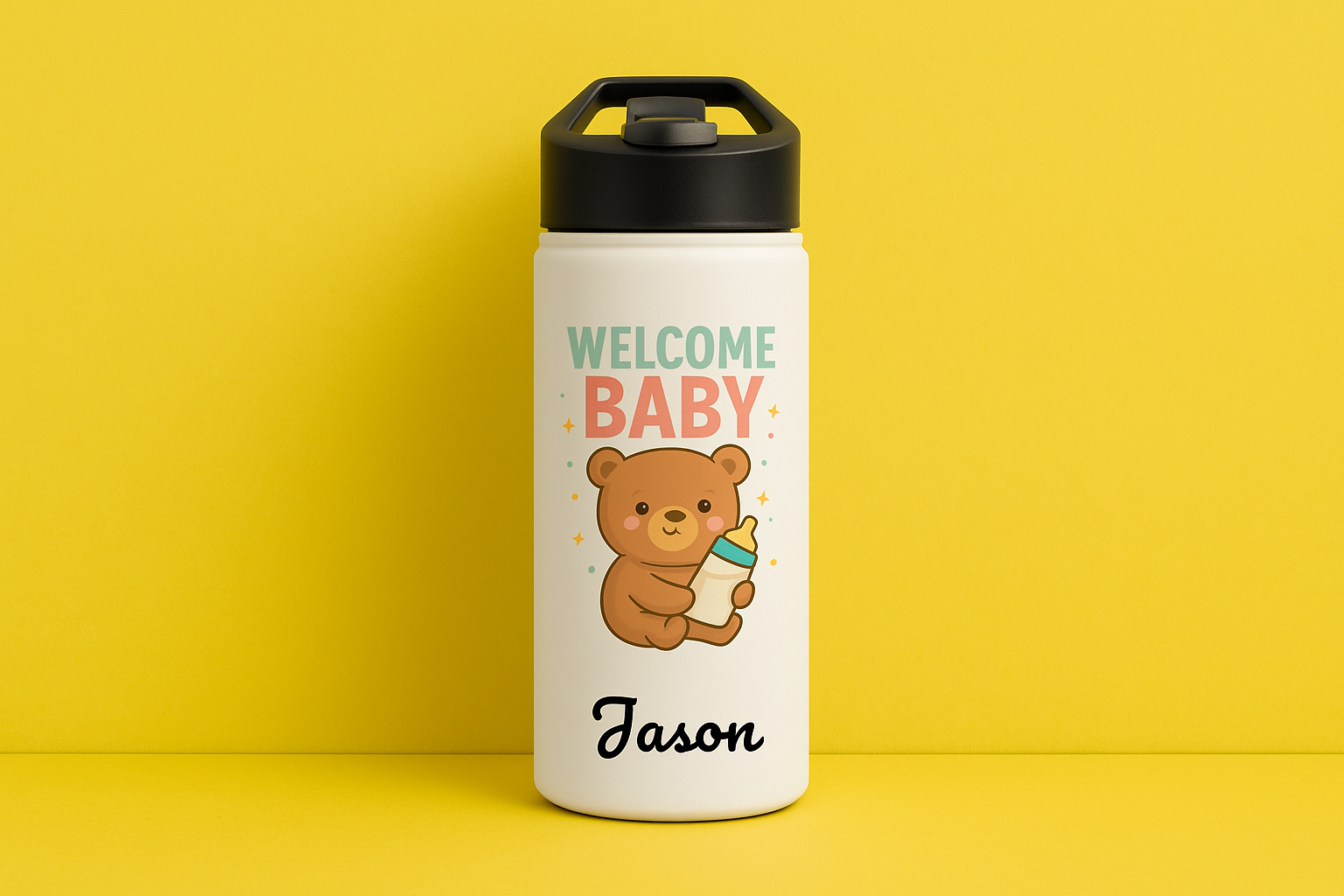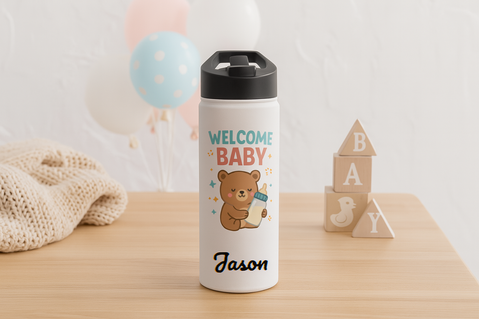 Celebrate a beautiful new beginning with this adorable 18oz white bottle, personalized with the baby’s name . Whether it’s a baby shower gift or a welcome-home surprise, this bottle adds a personal, loving touch to the moment.