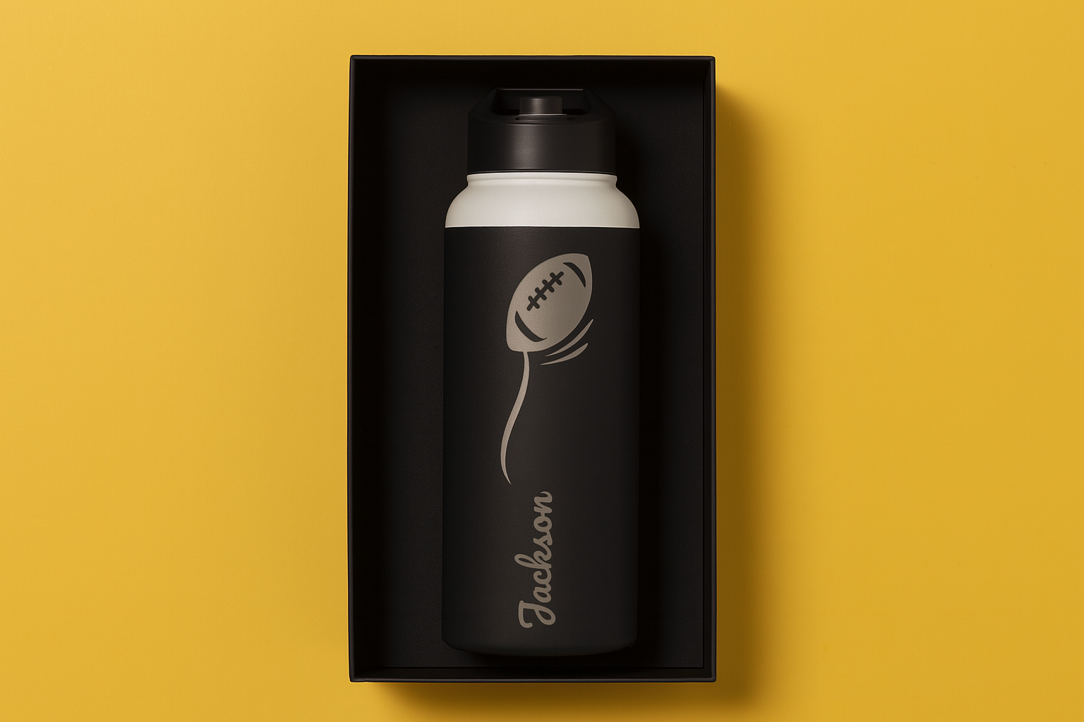 Tough like the game, bold like your passion — this 32 oz Matte Black Thermal Bottle features a sleek grey American football outline with a dynamic silver curve, capturing the energy of the sport in a modern, minimal design.